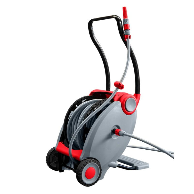 Mobilny wózek na wąż ogrodowy z automatycznym zwijaniem dzięki zamontowanemu pedałowi nożnemu. Wąż o długości 40 m + 2 m to idealne rozwiązanie dla osób ceniących wygodę w ogrodzie! A dzięki dodatkowej końcówce zraszającej ułatwia on podlewanie roślin!