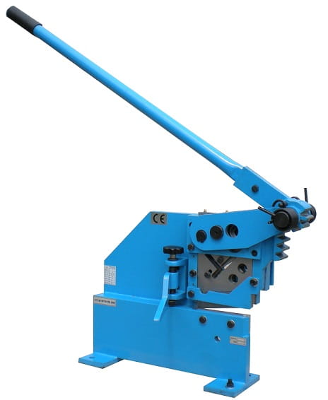 Nożyce gilotynowe do cięcia blachy, kształtowników i prętów. Cięcie stosunkowo grubych materiałów ręcznie, bez użycia dużej siły zapewnia masywna i stabilna konstrukcja maszyny.