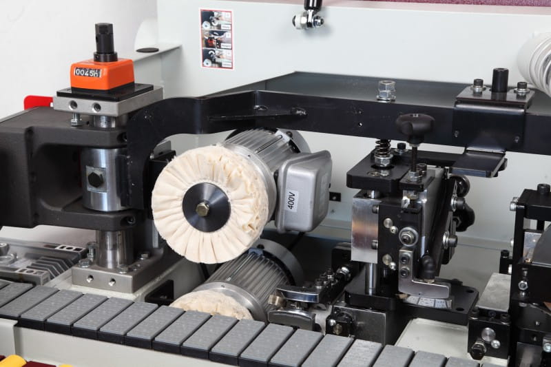 - Prostoliniowe dosyłanie formatek meblowych, kolejno do poszczególnych zespołów obróbczych, zapewnia posuw mechaniczny składający się z mocnego podajnika łańcuchowego i docisku rolkowego. Gumowe rolki i nakładki łańcucha nie powodują zarysowań nawet na delikatnej fakturze oklejanych płyt (np. płyty lakierowane).