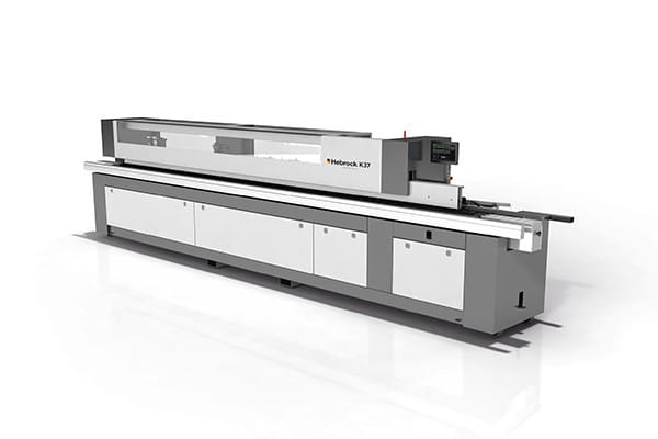 Okleiniarka K37 wąskich płaszczyzn niemieckiej firmy Hebrock to mistrz w oklejaniu krawędzi, wyznacza nowe standardy w wielozadaniowości i łatwości w obsłudze. Okleiniarka z systemem nakładania kleju na krawędź elementu i okleinowania obrzeżem o grubości od 0,4 do 3 mm w elementach o grubości od 8 do 60 mm, wstępnym frezowaniem płyty frezami diamentowymi i zarabianiem naroży K37 to największa okleiniarka z miejscem na wszystkie dostępne urządzenia wykończeniowe wyposażona optymalnie do każdego rodzaju obrzeża.