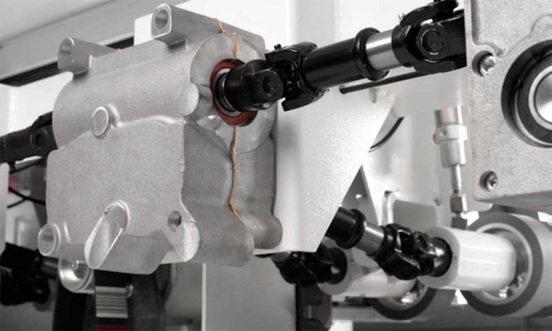 Niezawodność maszyny (stabilność i odporność na zużycie bez konserwacji) gwarantują stoły robocze ze stali Hardox oraz przekładnie napędowe Cardana.