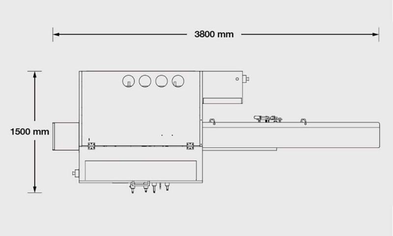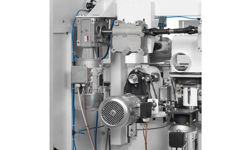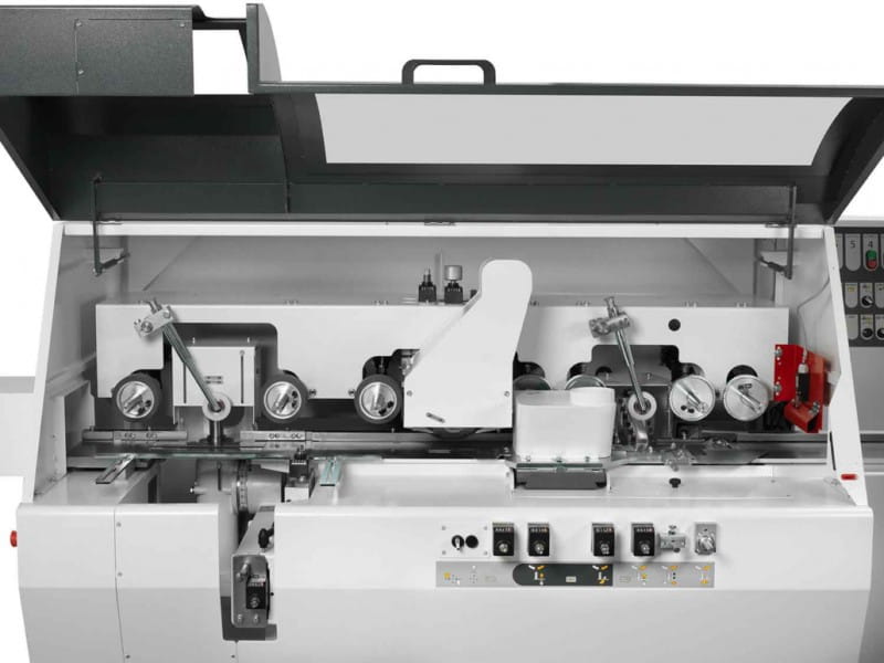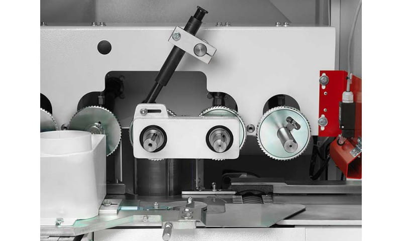 Maszyna standardowo jest wyposażona w stół roboczy 2300 mm, pneumatyczny docisk rolek napędowych, uruchamianie silników przyciskiem, pneumatyczny wałek wstępnego strugania, podnoszenie silnikowe.