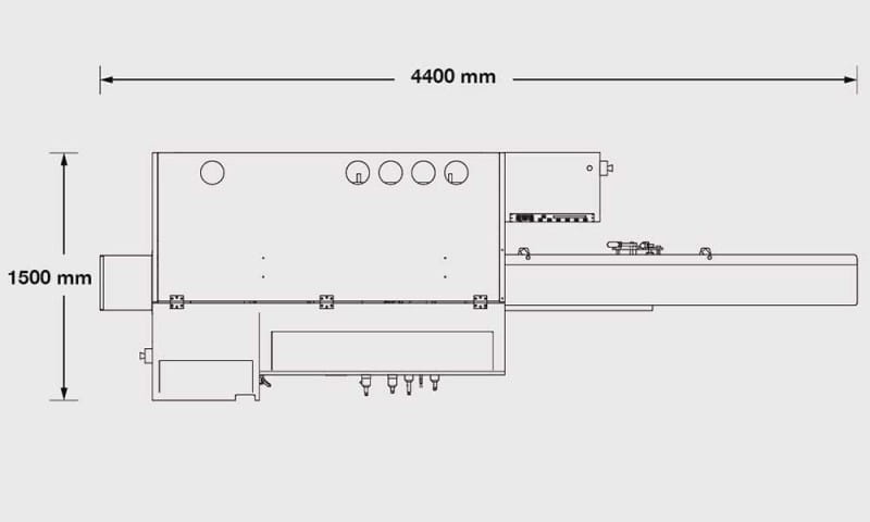 Maszyna standardowo jest wyposażona w stół roboczy 2300 mm, pneumatyczny docisk rolek napędowych, uruchamianie silników przyciskiem, pneumatyczny docisk rolek, podnoszenie automatyczne, zastosowanie przegubów Cardana.
