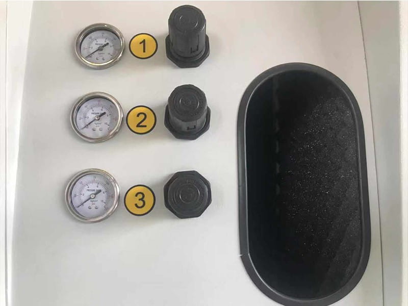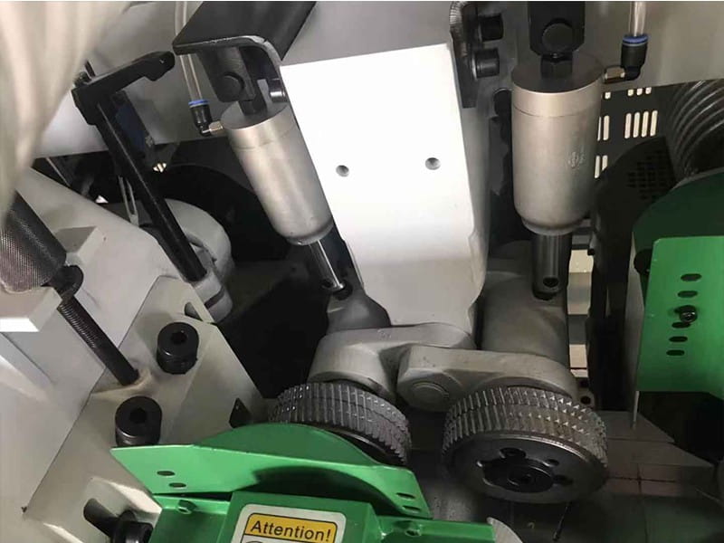 - Pneumatyczna regulacja osobno dla każdej górnej rolki podającej umożliwia wydajniejszy posuw materiałów o różnej grubości