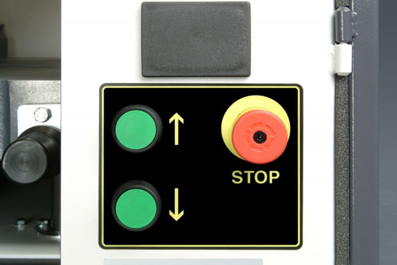 - Pionowa elektryczna regulacja grubościówki. Cyfrowy odczyt wysokości elementu. Naciśnij i długo przytrzymaj przycisk jeśli chcesz włączyć szybki rozruch. Aby włączyć tryb mikro-regulacji naciśnij przycisk i krótko go przytrzymaj. Dokładność do 1/10 mm.