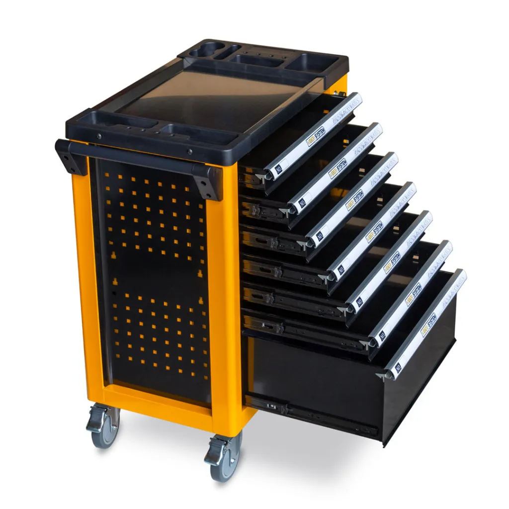 Wózek narzędziowy bez wyposażenia, idealny do przechowywania i organizacji narzędzi. Wykonany z wytrzymałego materiału SPCC, z dodatkową ochroną w postaci powłoki proszkowej, co zapewnia odporność na uszkodzenia i korozję. Wózek posiada blat ze stali nierdzewnej 201SS, który jest łatwy do utrzymania w czystości. Wyposażony w kółka z hamulcami, wózek jest łatwy do przemieszczania i stabilny podczas pracy. Posiada różne rozmiary szuflad, co umożliwia przechowywanie narzędzi o różnych gabarytach. Dodatkowa boczna zamykana szafka posłuży na inne akcesoria.