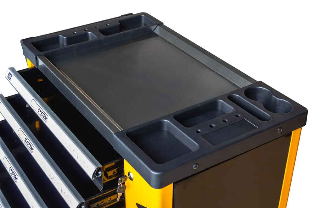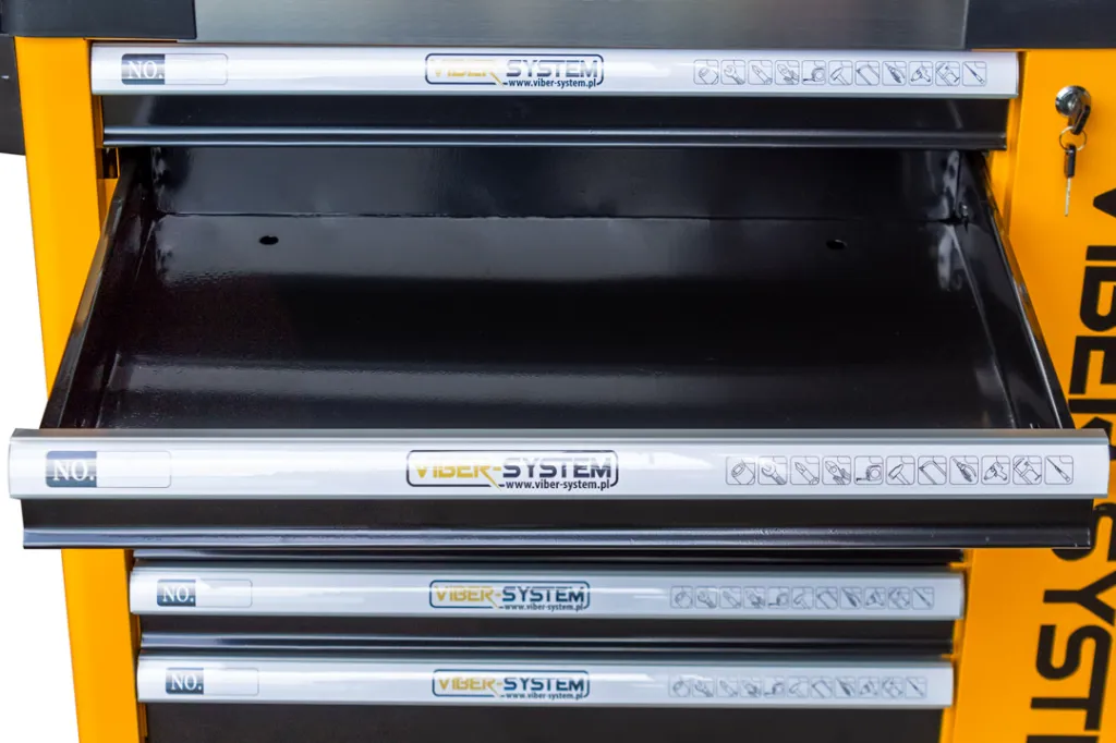 - Bezpieczeństwo narzędzi Wózek wyposażony jest w centralny zamek, który umożliwia zamknięcie wszystkich szuflad jednym kluczem. Dzięki temu narzędzia są chronione przed kradzieżą i nieoczekiwanym otwarciem szuflad.