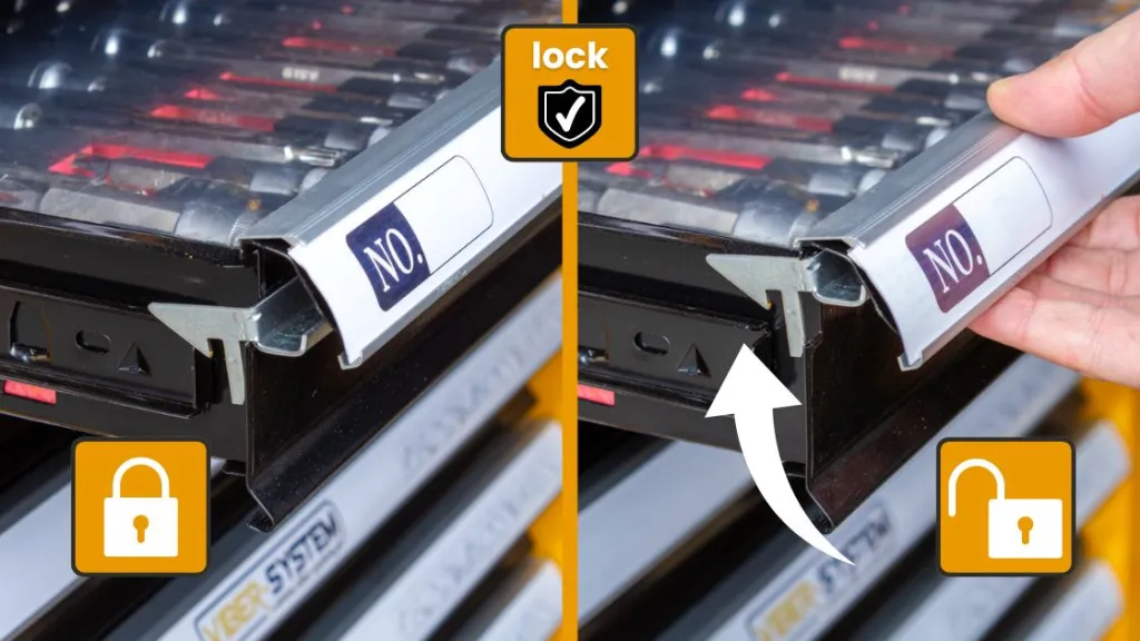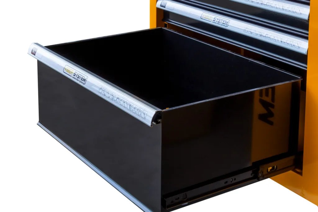 - Każda szuflada zabezpieczona blokadą zapadkową, chroniącą zawartość podczas przemieszczania.