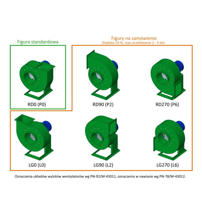 Wentylatory w magazynie dostępne są w widocznej na zdjęciach figurze (RD 0). Pozostałe figury (obrót i/lub lustrzane odbicie) wykonywane są na zamówienie (prosimy o kontakt telefoniczny lub mailowy).