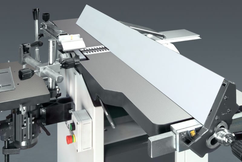 Wielkogabarytowa, anodowana prowadnica wyrówniarki, pozwala na łatwą obróbkę. Możliwość ustawienia prowadnicy pod dowolnym kątem za pomocą specjalnej skrętnej głowicy bez szczeliny pomiędzy prowadnicą, a powierzchnią stołu.